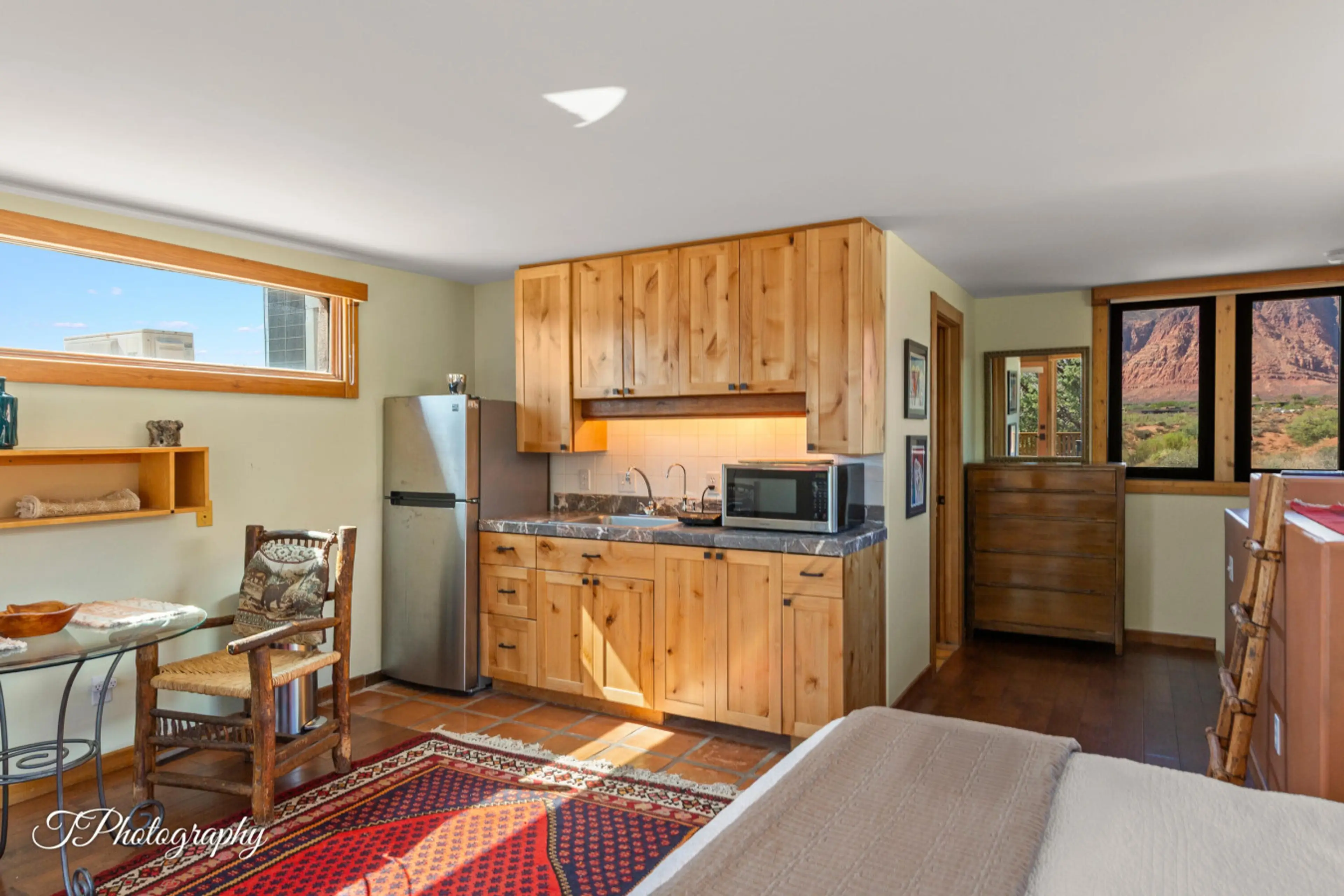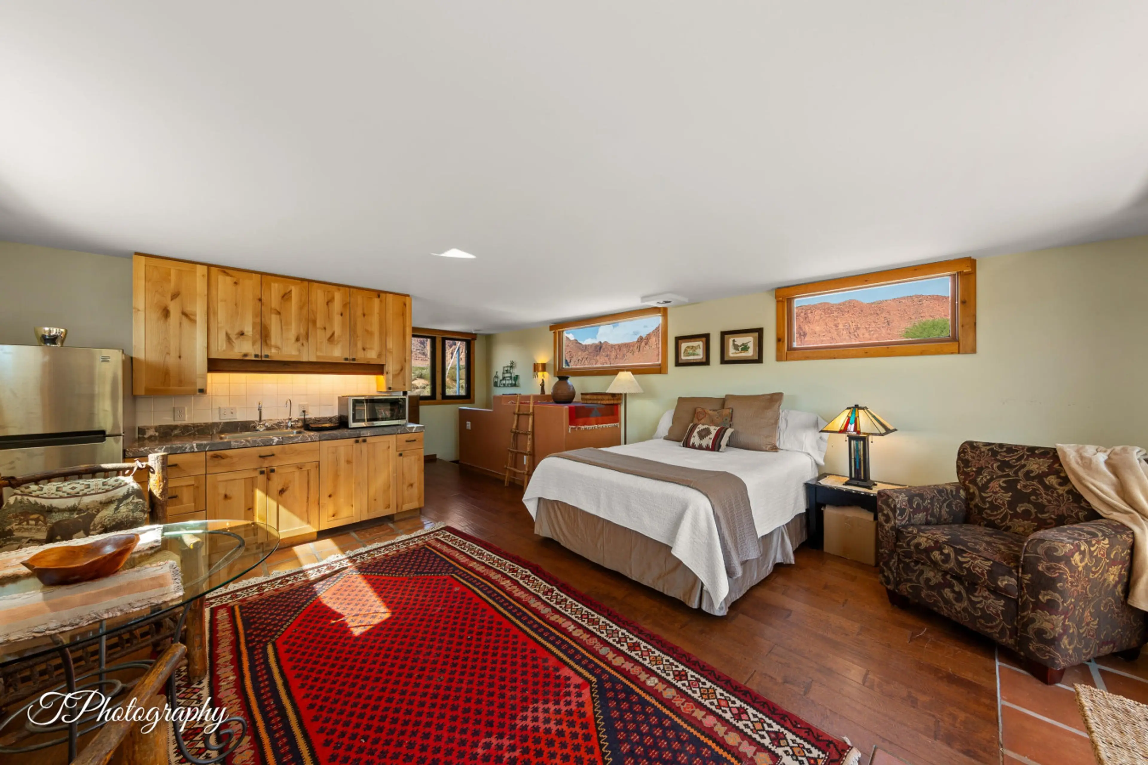 Upstairs studio suite with kitchenette. One Queen Bed, private bathroom with tub/shower. Chairs and a dining table for two located with small furnished sitting area next to the bed with flat screen TV. Balcony is furnished with chairs and a table. No pets allowed. End Unit.